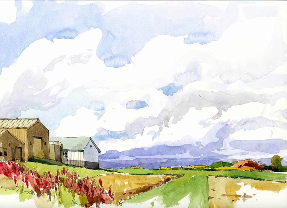 I’ve painted in many Moleskine books but they’ve always been watercolour paper. The new one I am trying is the Moleskine Sketchbook and I bought it because it is a vertical format instead of horizontal like the ones I am used to painting in. It’s listed in the online catalogue as “perfect for pencil, charcoal, fountain pen, tempera, acrylic, etc.” so I assumed it would be good for watercolour too, or at least light washes. Wrong! It is as if the paper has some type of resist on it and the wash just beaded and sat on top of the paper. My sketch in that book was of the same scene as this but it was very unsuccessful. I’ll have to do some more research into this to find out if other people have the same problem as me.