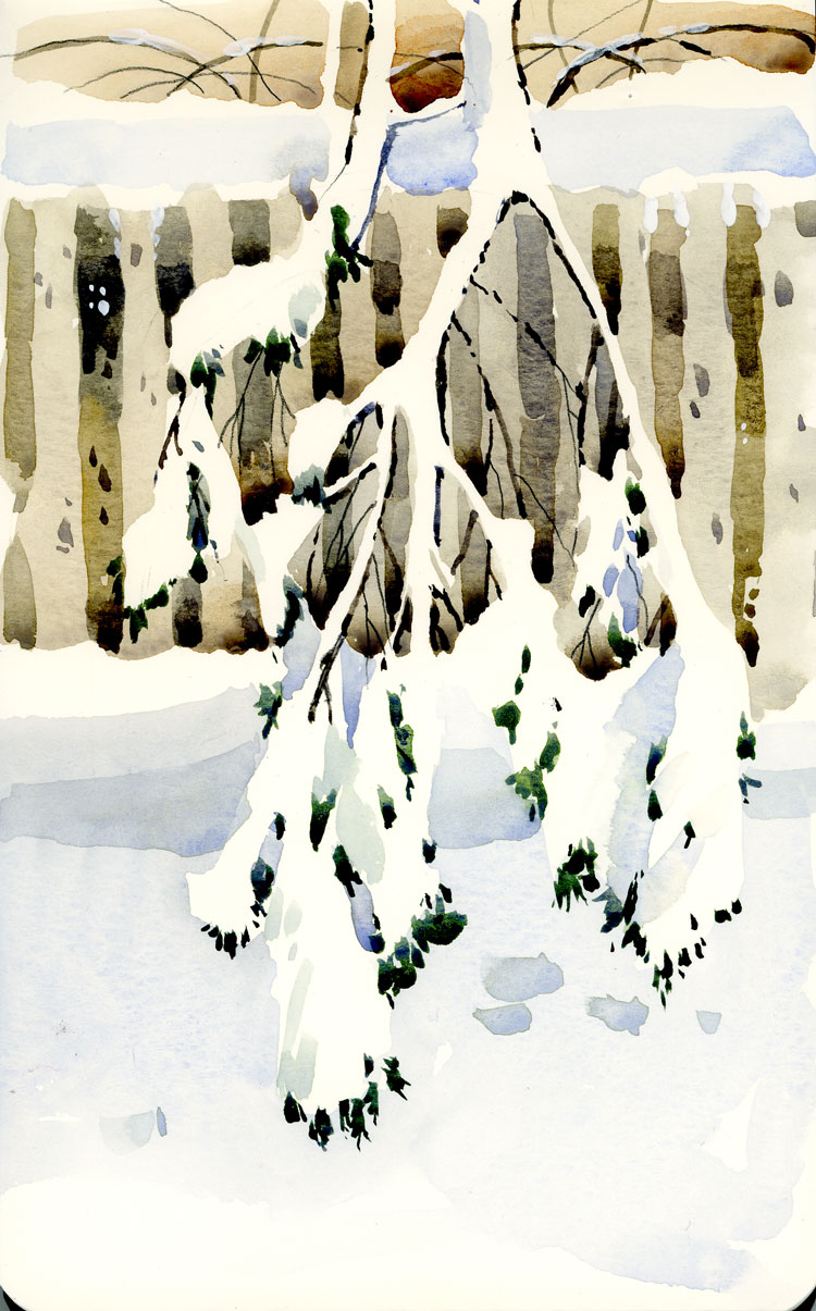 Posted: March 20, 2013 Filed under: Uncategorized 20 CommentsYesterday I had so much fun doing a negative painting with no pencil lines that I repeated the exercise today. Just turned the branches upside down. Painting the spaces between things requires patient observation and a good amount of wash on the brush. I started in the middle of the sheet and did a light wash of the parts of the fence that I could see between the branches. Then I added the dark bits of evergreen under the snow. By that time the fence was dry so I added the darker parts of the fence. The last step was the lacework of branches that tied it all together.