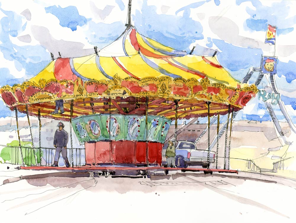 Posted: September 19, 2012 Filed under: Uncategorized 9 CommentsI went back to the shopping mall parking lot carnival again today to see how things were going with the set up. Just as I started painting, the carousel starting spinning and the guys began unloading the wooden horses. If I go back tomorrow I may even be able to take a ride on the Zipper.