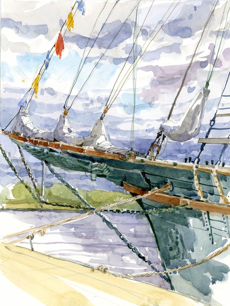 Posted: September 16, 2012 Filed under: Uncategorized 5 CommentsThe tall ship Peacemaker is 150 feet long but I couldn’t get far enough away to draw the whole vessel so I chose a detail. The light was hitting the rolled up sails just right against the turbulent sky. And if you tuned out the crowds of people lining up to board the ship it seemed that we had been transported to another era — a time of adventure or exploration or conquest.