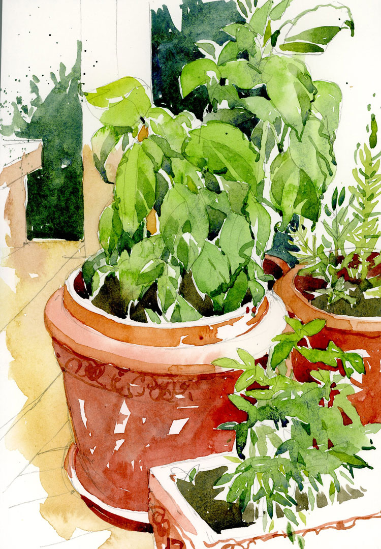 I am trying out a few new supplies before I go to Santo Domingo. It’s true that I have been a little bit obsessed with my Moleskines of late but I bought three new types of watercolour pads and this was the first one I am testing. The paper is Strathmore Windpower Watercolor and as far as I could tell in the almost dark, it took the paint really well. I also bought a few new synthetic brushes that I noticed Marc Holmes working with the other day. My small sable brushes have lost their points and this inexpensive Omer de Serres brush did a great job of both holding the paint and creating fine lines like those on the big clay pot. It’s a bit stiffer than the sables I’m used to but that makes it almost like a brush pen. Tomorrow I’ll probably try out the Fabriano pad I bought and then Sunday I’ll give the Arches paper a try.